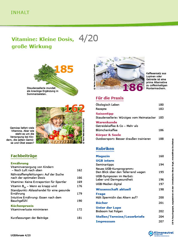 Ohne Präparate versorgt sich optimal, wer Lebensmittel frisch und schonend zubereitet und abwechslungsreich isst. Gesunde Menschen, die die Grundsätze der Vollwert-Ernährung beherzigen, sind in der Regel gut mit allen Vitaminen versorgt. Aber es gibt auch Ausnahmen, wie diese Ausgabe des UGBforum berichtet. Auf welche Vitamine in der Ernährung von Kindern besonders zu achten ist, ob Sportler Supplemente benötigen und was bei der Einnahme von Vitamin B12 zu berücksichtigen ist, erfahren Sie in diesem Heft. Außerdem gibt es Tipps zum vitaminschonenden Einkaufen, Zubereiten und Lagern.